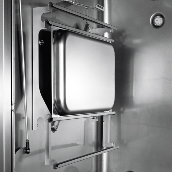 La récupération d’énergie optionnelle sur les modèles de porte frontale tire profit de l’énergie des buées très chaudes de 60 °C pour le réchauffement de l’eau propre. L’humidité et l’énergie ne sont pas expulsées de manière incontrôlée dans l’atmosphère, mais récupérées avec efficacité par le biais d’un échangeur thermique.