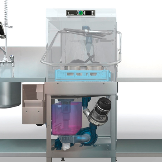 Les lave-ustensiles PREMAX sont capables de pulvériser un produit de nettoyage concentré directement sur les ustensiles. La solution liquide entame le travail de destruction de la saleté résiduelle avant que la vapeur ne passe à l’action.