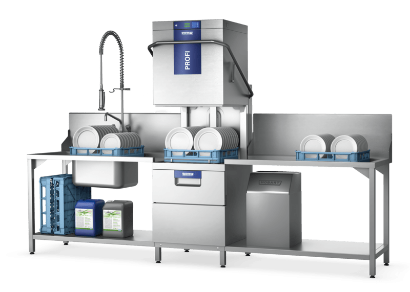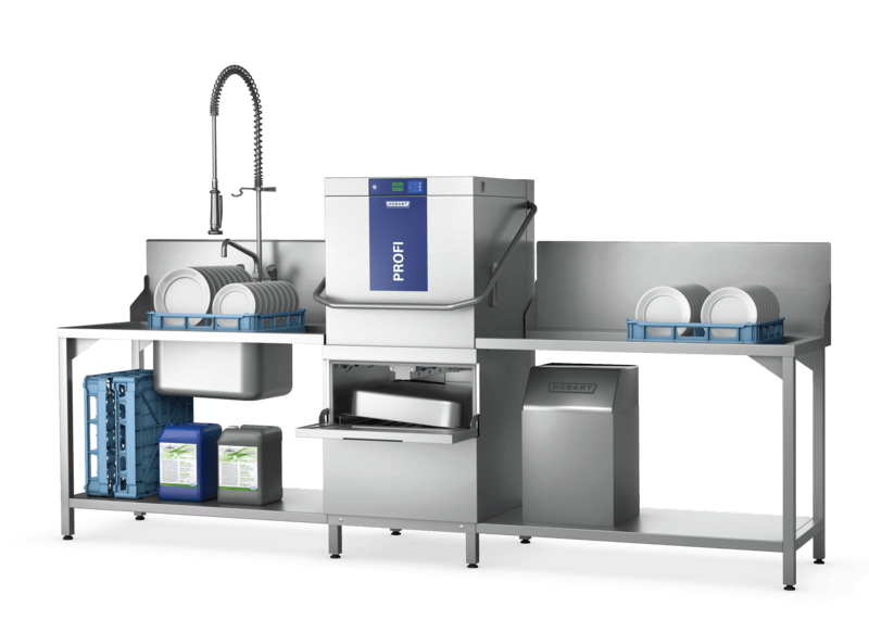 Prêt à installer - équipement complet : tuyaux d'arrivée d'eau / vidange, cable d'alimentation, doseurs de détergent et rinçage, pompes de rinçage et de vidange, brise-vide